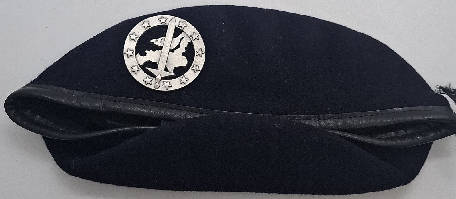 Beret tłoczony, sukienny, granatowy (navy blue). Denko wyszyte podszewką. Lamówka wykonana ze skóry. Wewnątrz materiałowa taśma do regulacji rozmiaru. Pod odznaką tworzywowa podkładka. Na podszewce wszyta metka producenta.