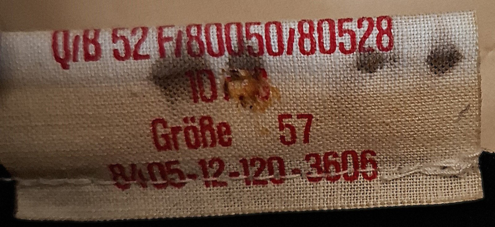 Otok z grubego tworzywa obszyty sukiennym materiałem w kolorze czarnym. Na nim nałożona taśma otokowa z napisem haftowanym złotymi nićmi. Potnik z czarnej elastycznej, perforowanej skóry. Pod nim wąski pasek gąbki. Na zewnątrz nałożone denko z białego materiału tworzywowego z góry jednolity, od spodu złożony z 4 kwater. Denko wyłożone białym materiałem. W denku transparentny romb ze stemplem producenta, daty produkcji i rozmiaru. Wewnątrz, w rondzie denka, usztywniacz denka wykonany z metalowej taśmy. Na przedniej kwaterze znajduje się bączek w narodowych barwach niemieckich.