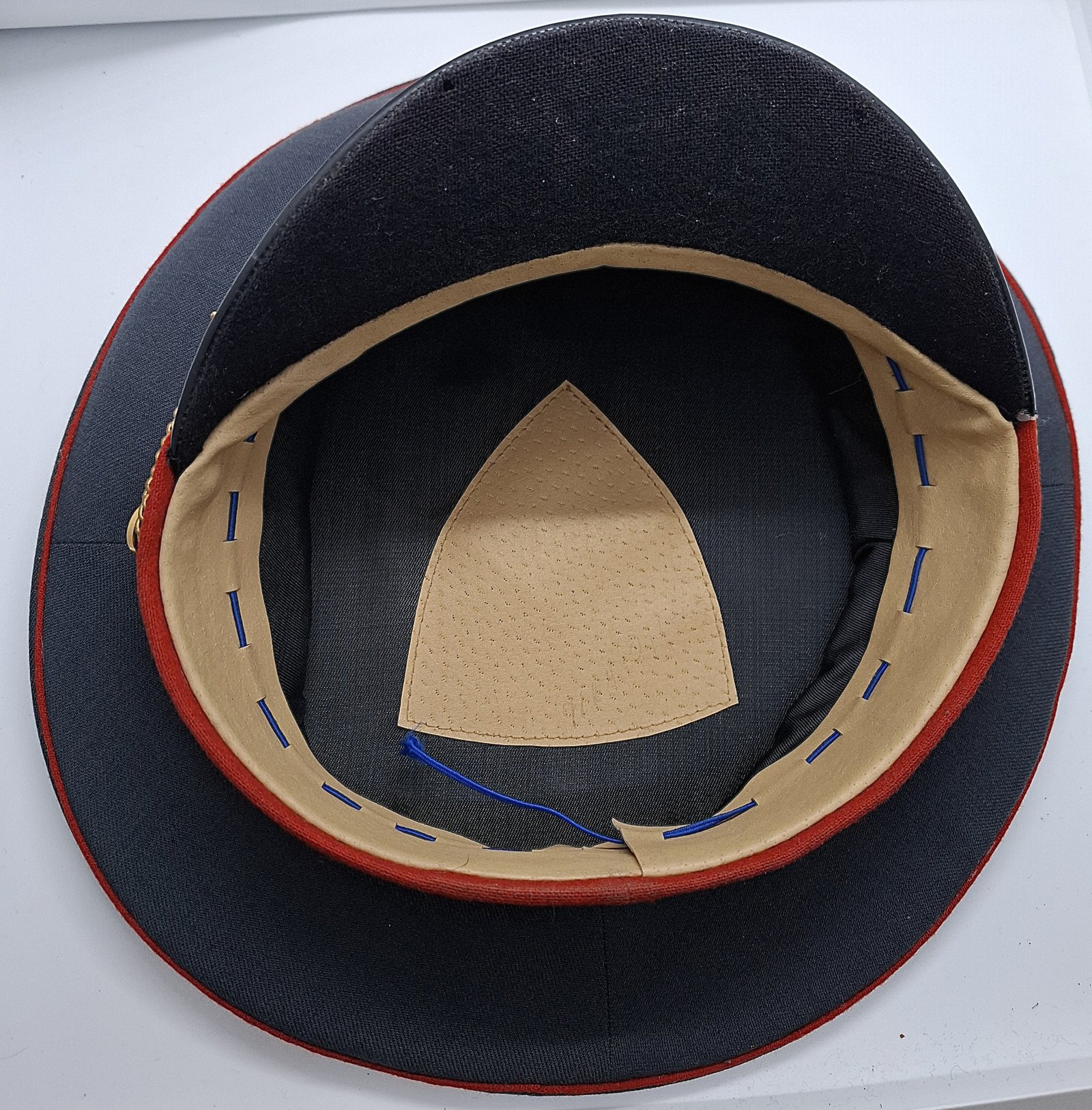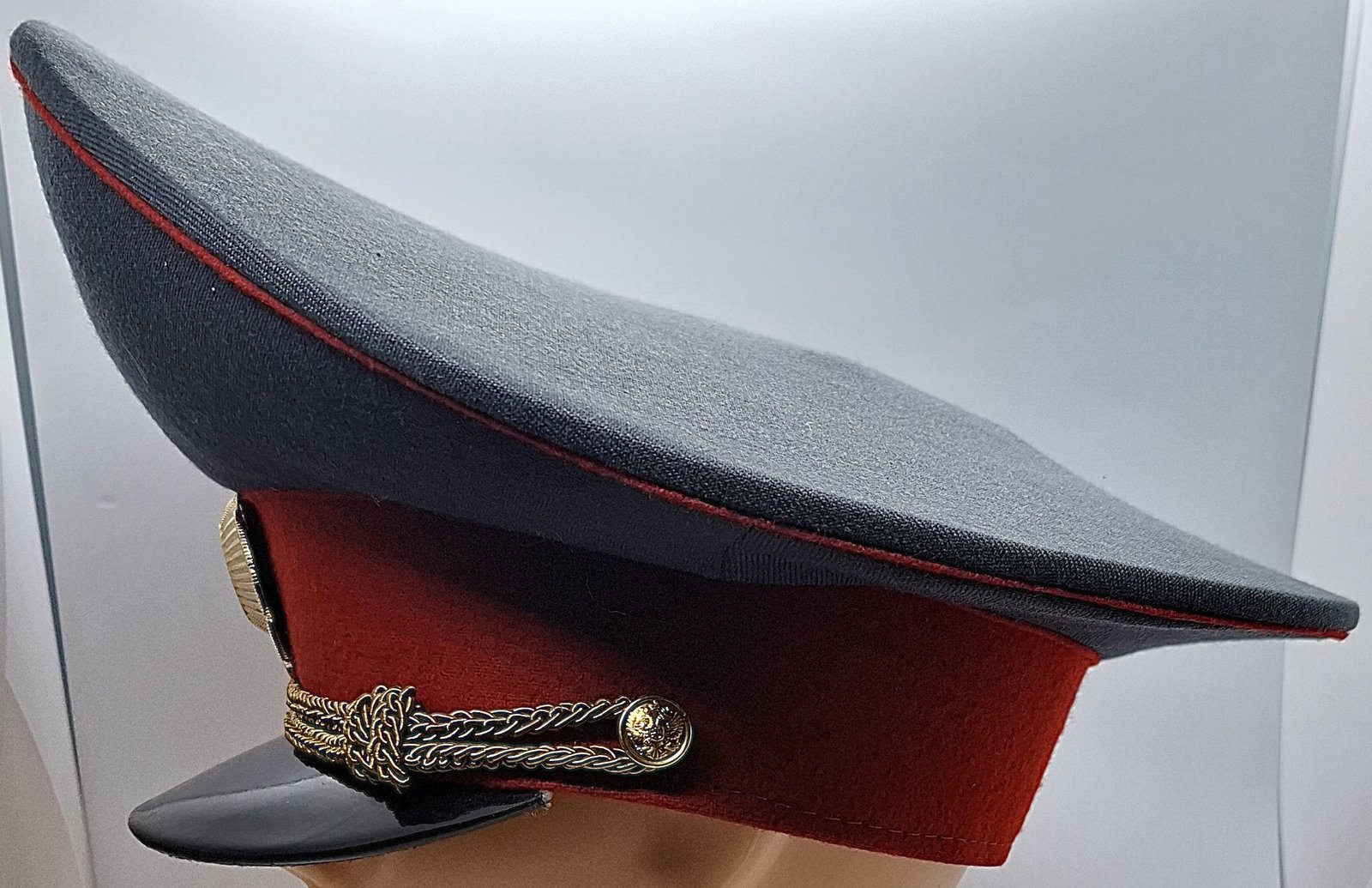 Materiał zasadniczy to gabardyna w kolorze szarym. Kształt czapki przyjmuje formę okrągłą denka o zwiększonej średnicy. Między dnem, a kwaterami zaszyta wypustka z czerwonego sukna. Podobnie między kwaterami i otokiem. W przednich kwaterach usztywnienie z gąbki. Brak wietrzników. W całym wnętrzu znajduje się atłasowy materiał koloru materiału zasadniczego. Na środku wszyta skórzana osłona denka. Denko usztywnione prętem tworzywowym(?). Potnik wykonany ze skóry w kolorze naturalnym i wpuszczonym sznurkiem w kolorze niebeskim. Daszek czarny, wykonany z tworzywa sztucznego. Z góry gładki i błyszczący, od spodu wszyty materiał podobny do czarnego sukna. Całość usztywniona (tekturą?). Pasek podbródkowy w formie plecionego, złotego, dwuczęściowego sznurka. Przytwierdzony dwoma tworzywowymi złotymi guzikami z godłem rosyjskim w postaci dwugłowego orła. Guziki wprawdzie mają uszko ale mocowane za pomocą metalowych wąsów. Usztywnienie otoku wykonane prawdopodobnie z grubego tworzywa sztucznego. Otok wykonany z czerwonego sukna, takiego jak na wypustkach. Na przodzie otoku tworzywowa odznaka - kokarda w barwie rosyjskiej flagi w wieńcu z 10 liści, mocowana na metalowe wąsy. Wyżej, na kwaterach emblemat Ministerstwa Spraw Wewnętrznych (Министерство внутренних дел, МВД - Ministerstvo vnutrennikh del, MVD).