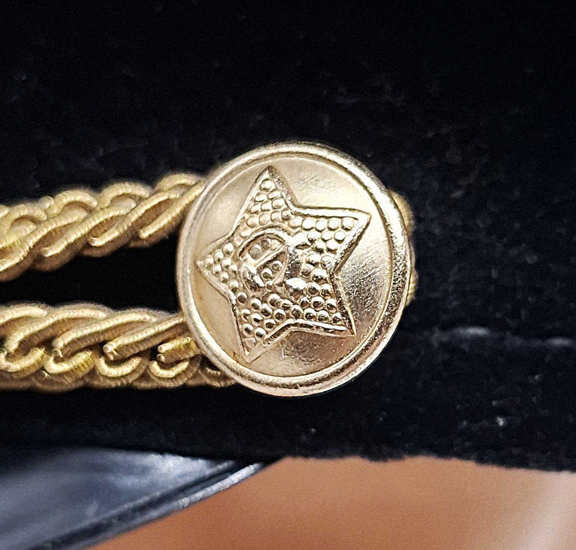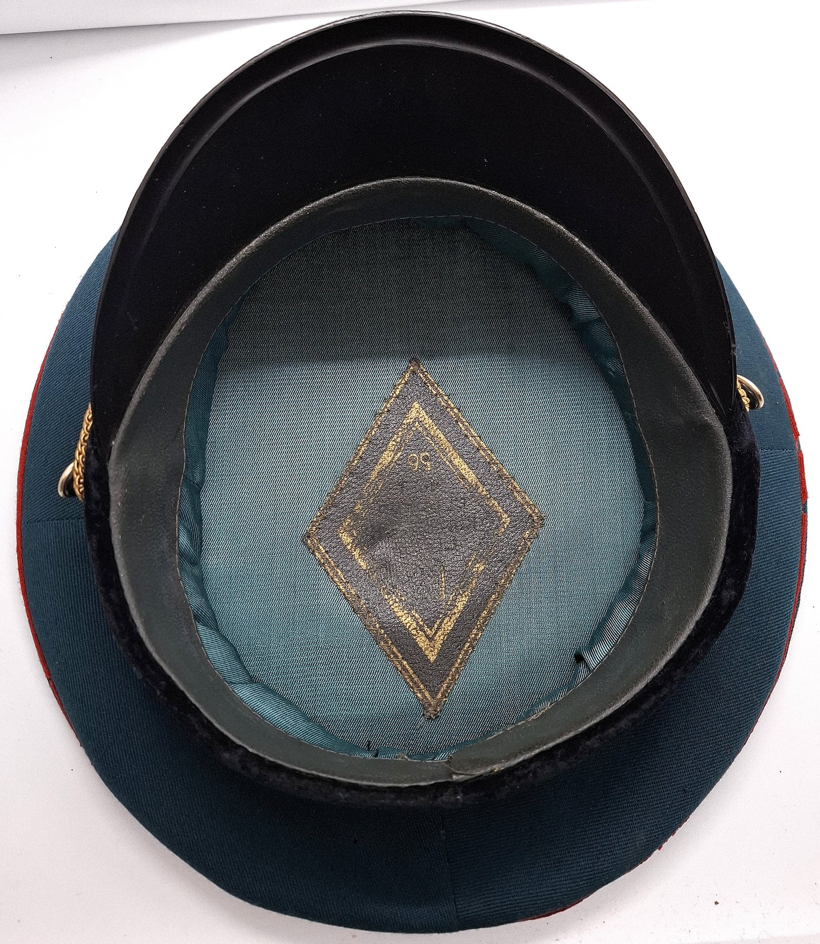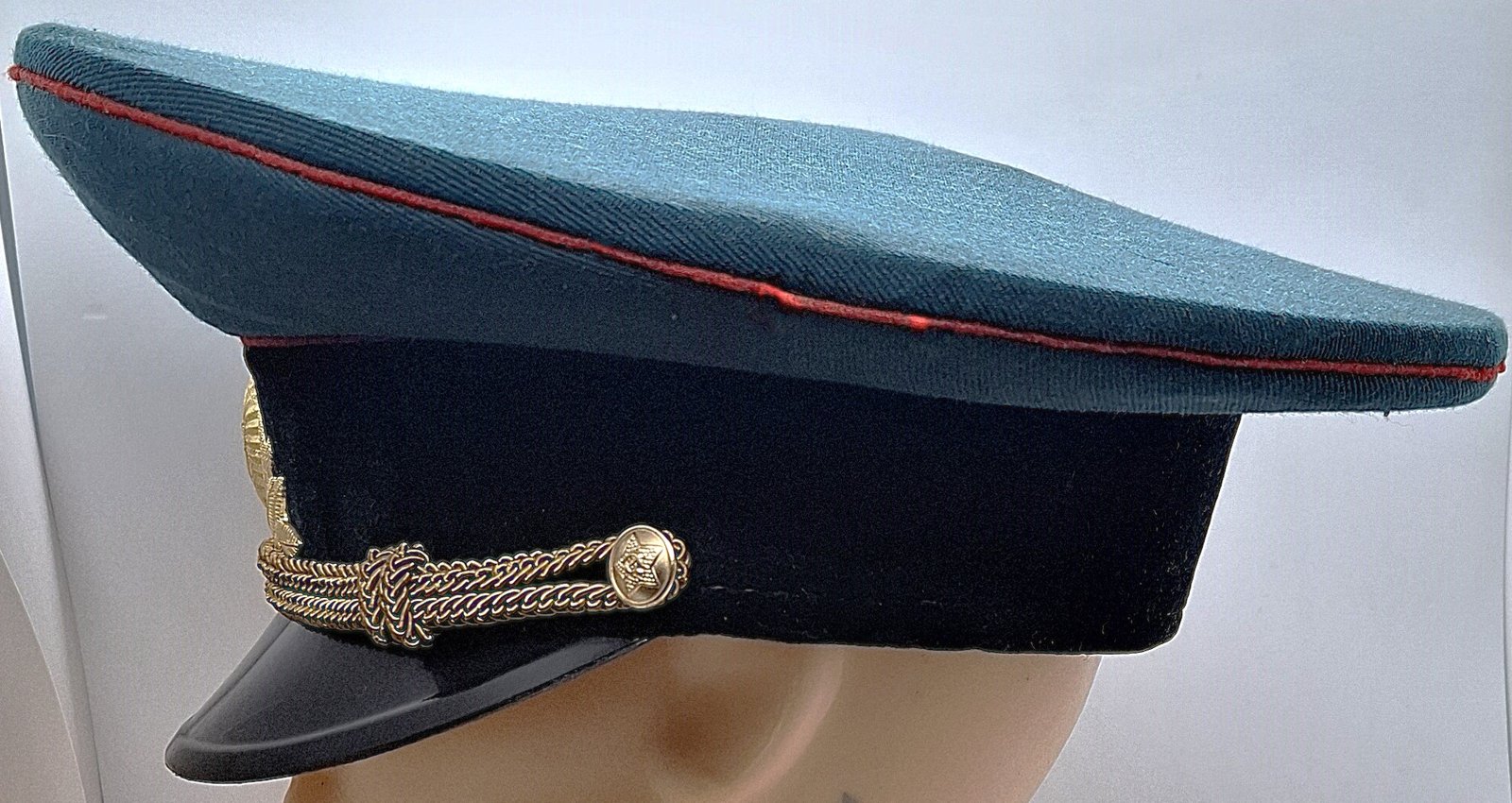 Czapka ma plastikowy czarny daszek. Otok wykonany z czarnego aksamitu. Pasek ze złotego łańcucha przypiętego złotymi guzikami dwuczęściowymi, metalowymi z metalowymi wąsami. Materiał zasadniczy podobny do gabardyny w kolorze ciemnozielonym/ciemnomorskim(?). Nad otokiem i w rancie denka czerwona wypustka. Dolna część denka wykonana z 4 kwater. Górna z jednego kawałka materiału. Na przodzie otoku odznaka plastikowa z wąsami, złota z czerwoną gwiazdą radziecką i sierpem i młotem z dużym wieńcem. Wewnątrz czapka wyłożona błyszczącym materiałem w jaśniejszym odcieniu materiału zasadniczego. Na środku denka wszyta skóropodona, rombowa wszywka z logiem producenta(?) i rozmiarem. Potnik wykonany z impregnowanego materiału skóropodobnego lakierowanego na szaro, łączony w tylnej części czapki (zszyty). Wewnątrz potnika wbita nieczytelna pieczątka. Sztywnik otoku wykonany z grubej tektury. W przednich kwaterach denka umieszczony sztywnik. Dodatkowy sztywnik pod odznaką sięgający rantu denka. Utrzymują właściwy kształt przedniej części denka.