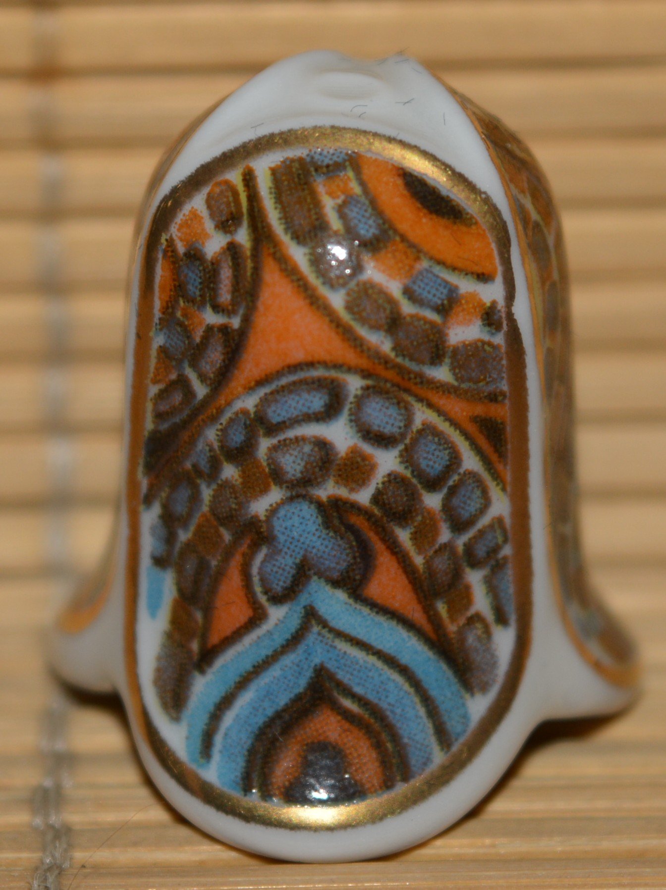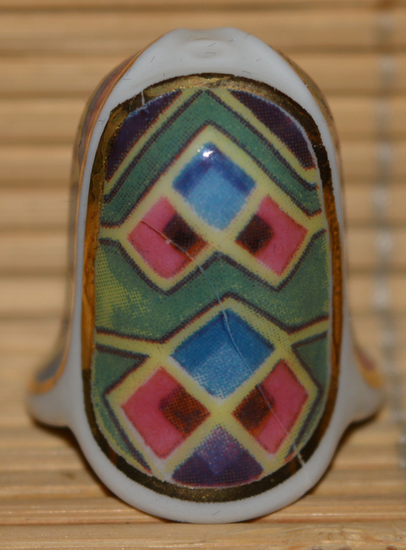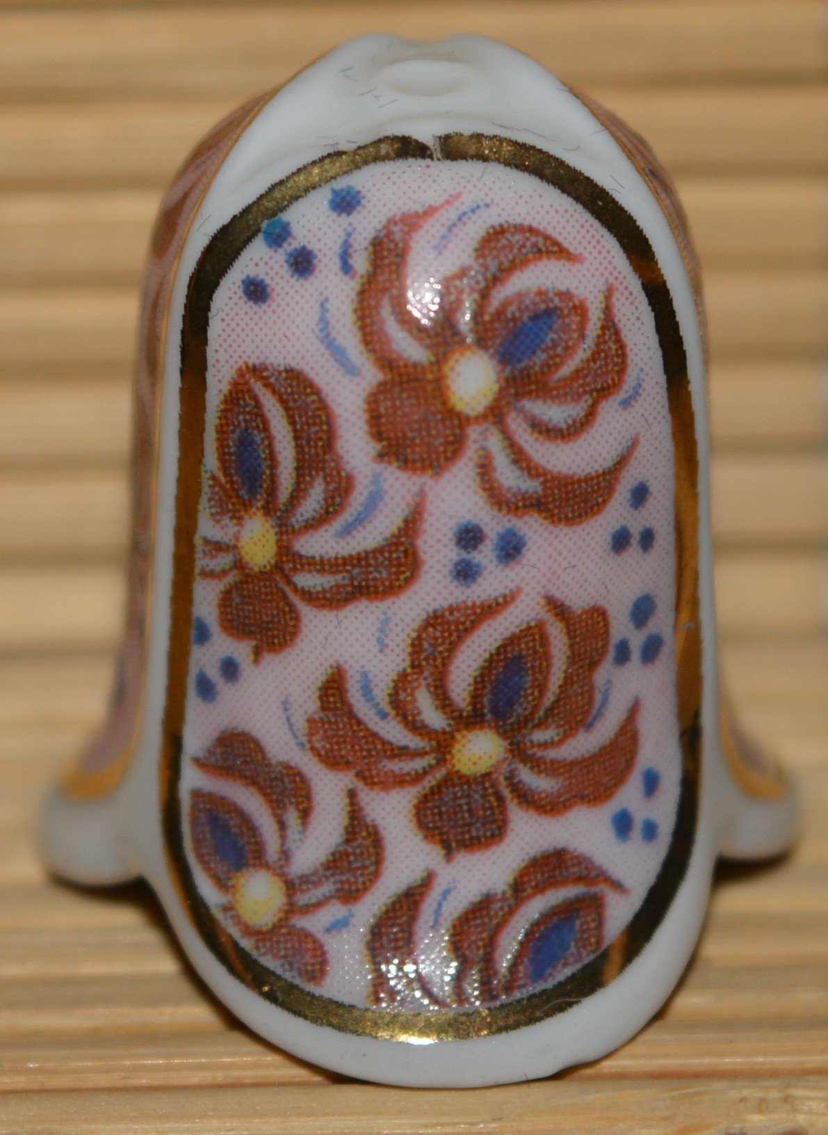 Naparstek porcelana Kolekcja o nazwie «Stoffmuster» czyli próbki tkanin obiciowych. Kolekcja liczy 15 naparstków w specjalnym pudełeczku z logo wytwórni. kształt naparstka przypomina kwiat dzwonka (trzy ścianki) sygnowany :Lindner Handarbeit