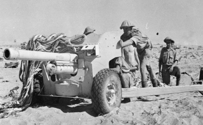 Zdjęcie czarno-białe (wykonane 29 października 1942 roku) przedstawia działon „sześciofuntówki” podczas ćwiczeń przed II bitwą pod El-Alamein. Fot. Imperial War Museum E18802, domena publiczna.