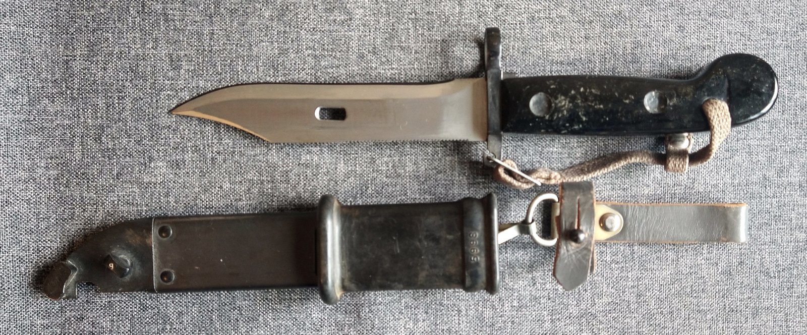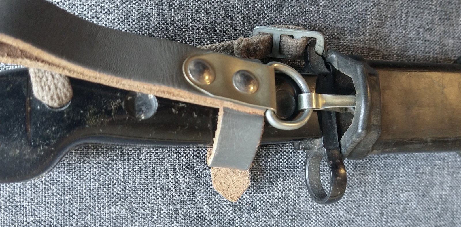 Żabka skórzana z karabińczykiem do podwieszania pochwy i z dodatkowym zapinanym paskiem, obejmującym rękojeść bagnetu.