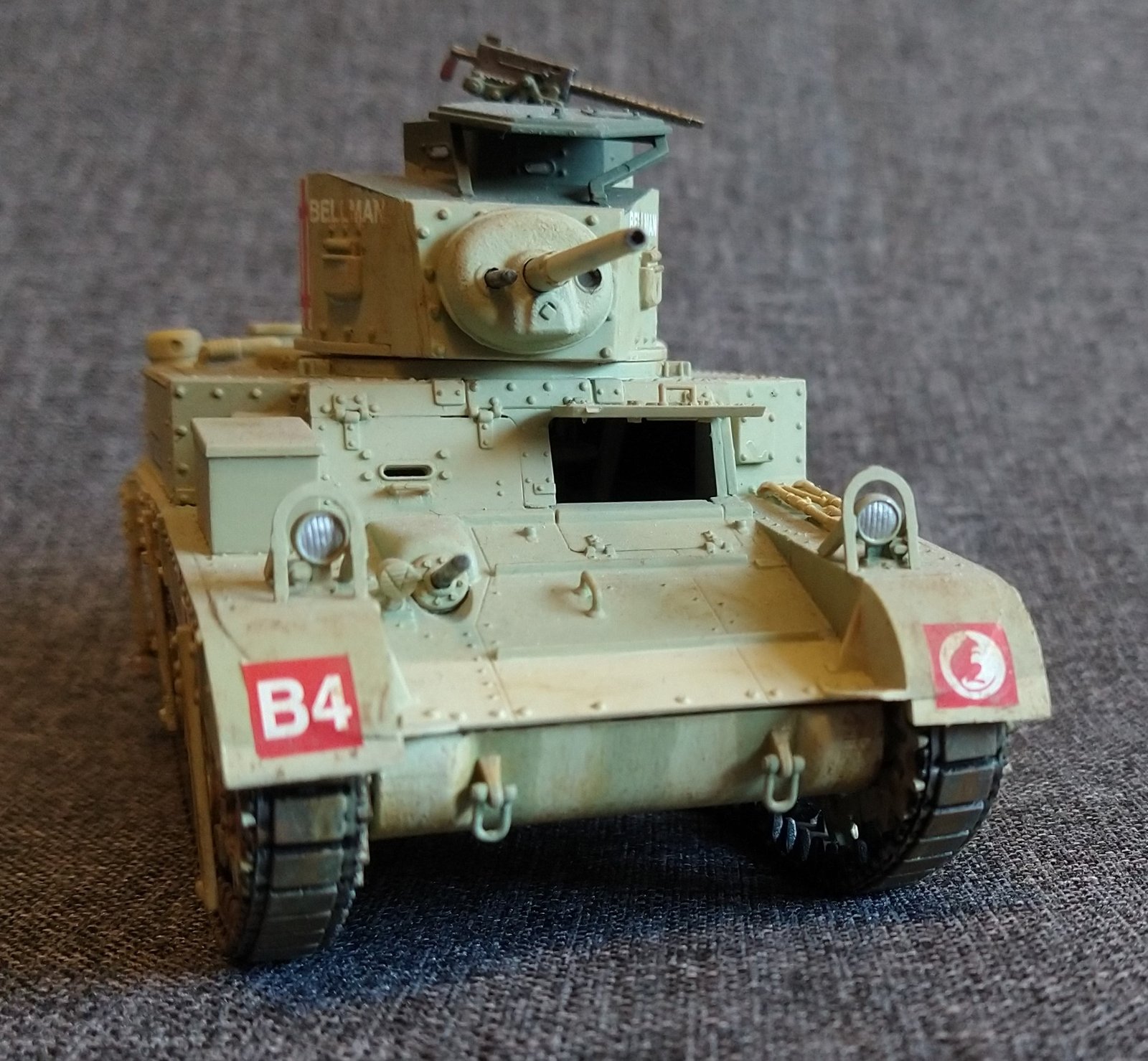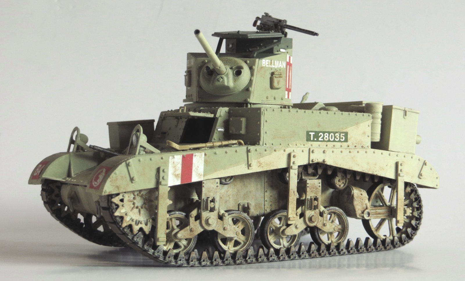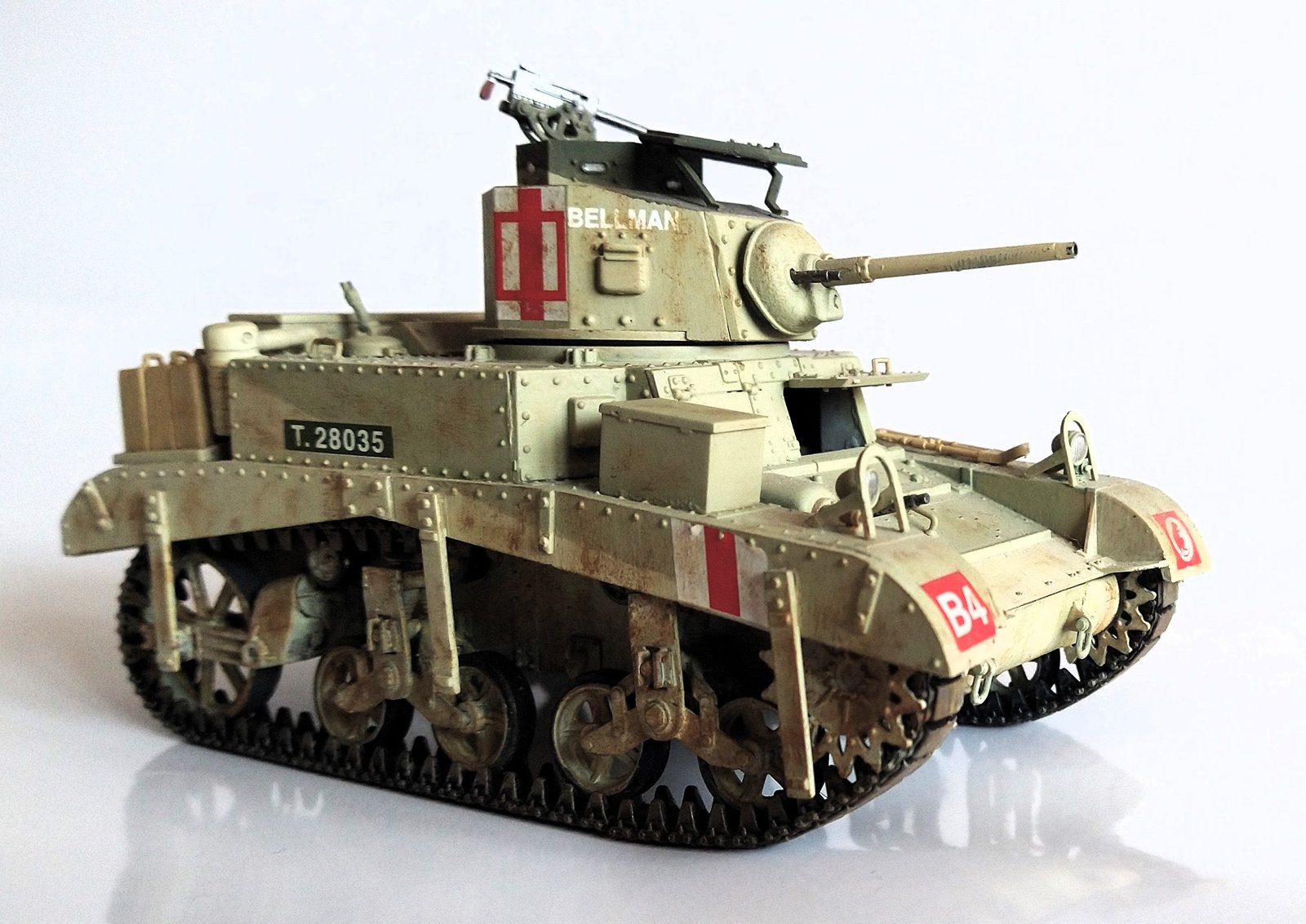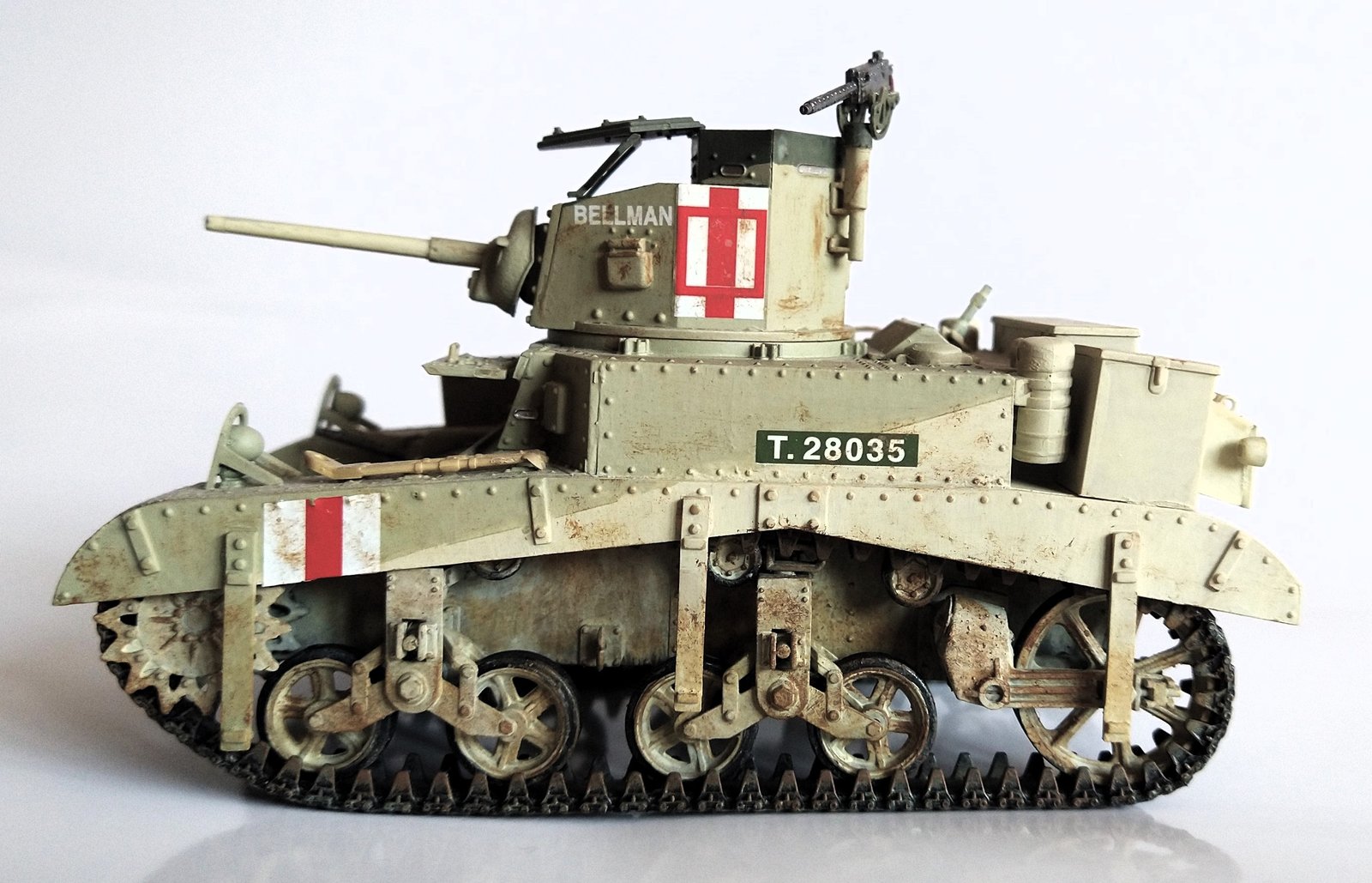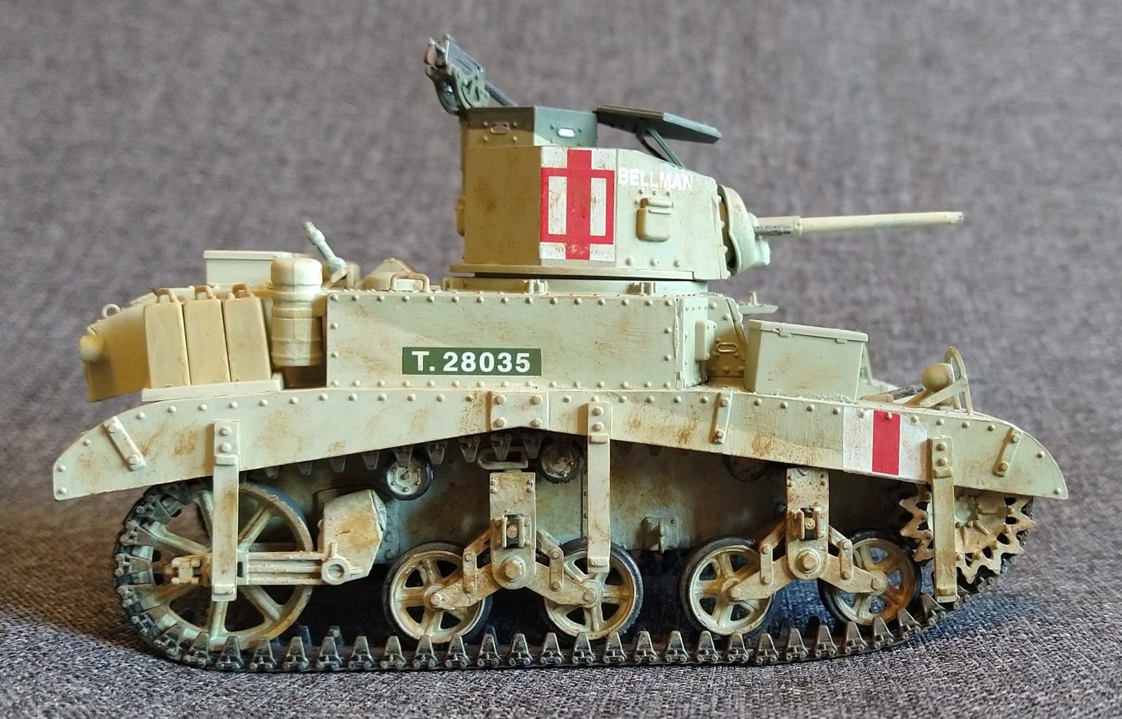 Czołg M3 w barwach brytyjskich, o nazwie własnej "Bellman" z "B" Squadron, 8th King's Royal Irish Hussars, 4th Armoured Brigade, 7th Armoured Division, listopad 1941. Pojazd w trójbarwnym kamuflażu pustynnym, tzw Caunter Scheme. Biało-czerwono-białe pionowe pasy były elementami szybkiej identyfikacji, wprowadzonymi przed operacją "Crusader". Czerwony kwadrat na wieży, namalowany na pasach szybkiej identyfikacji, oznacza szwadron "B" (symbol kwadratu) najstarszego pułku w brygadzie (kolor czerwony).